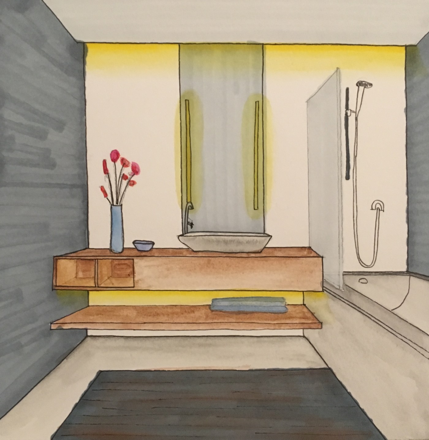 - In addition to the lighting concealed within the mirror build-up, cove lighting along an important wall can also provide enough diffuse light for the space. In the drawing above, the back wall “crosses” the shower and bath tube, lighting both softly.
