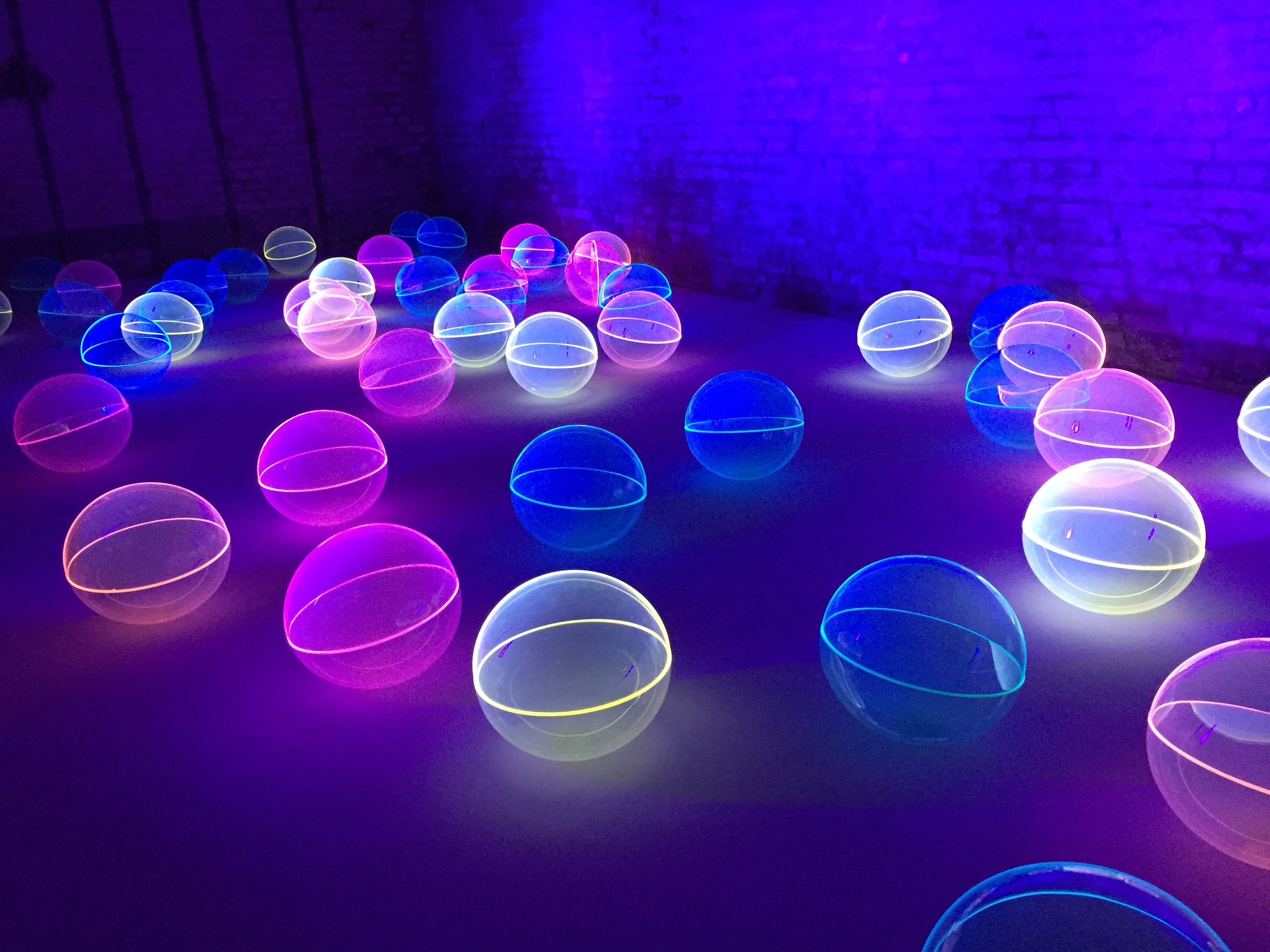In this post, I would like to highlight 4 different works, which were most interesting to me. The first work is from Regine Schumann (*1961 in Germany) and is titled “Dream Team”. Here, Regine plays with spheres of acryl glass, a white carpet and black light. Under black light both the carpet and the coloured spheres created a scene of play. It was actually very inviting to play with the balls under black light, but this was unfortunately not allowed… A pity, as I would have been quite happy to be able to move around them and making them move.