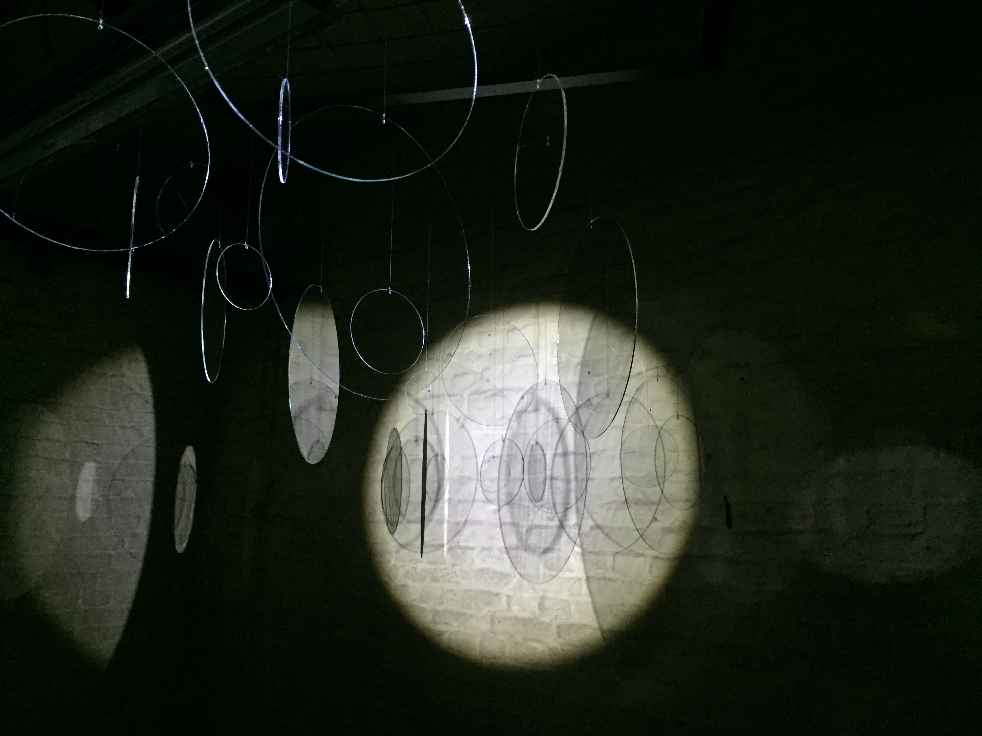 The third work is from 2 artists: Claudia Moseley (*1984 in England) and Edward Shuster (*1986 in England), titled “Quietude: In-Finites”. They collaborated to create an installation made of hand cut transparent glass circles of different sizes, which were suspended in the room and illuminated by LED projectors. The circles and their shadows were projected on the white surrounding walls. As the suspension allowed the circles to move slowly, a subtle play was created on the walls and in the room itself, as the borders of the circles were shining too. Providencially, a bench was put at the corner for visitors to quietly observe the effects created. Nice!